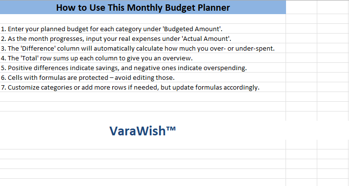 You’ll get a ready-to-use Monthly Budget Planner Excel Template with automated calculations, a pie chart for expenses, and easy-to-edit categories.