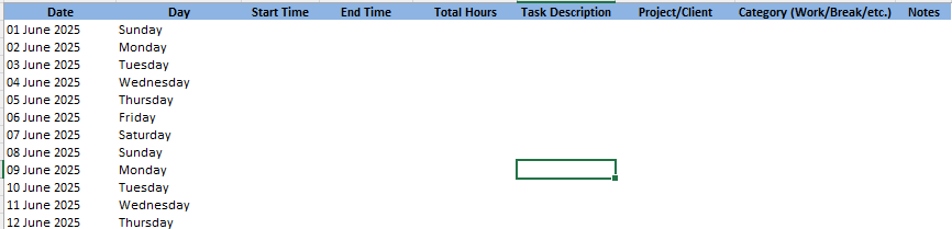 You’ll get an Excel Time Tracker with pre-filled dates, auto total hours, and task logging. Easy to edit and reuse monthly.