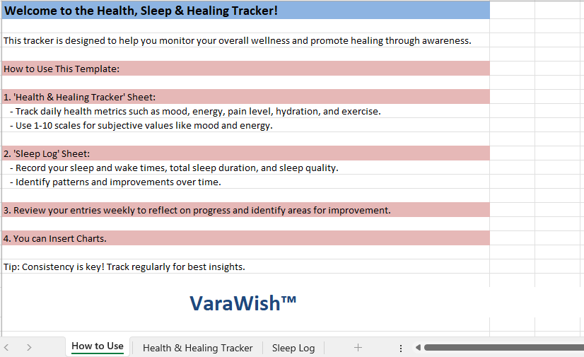 Bring balance and healing into your daily life with this Health, Sleep & Healing Tracker in Excel. 🌿